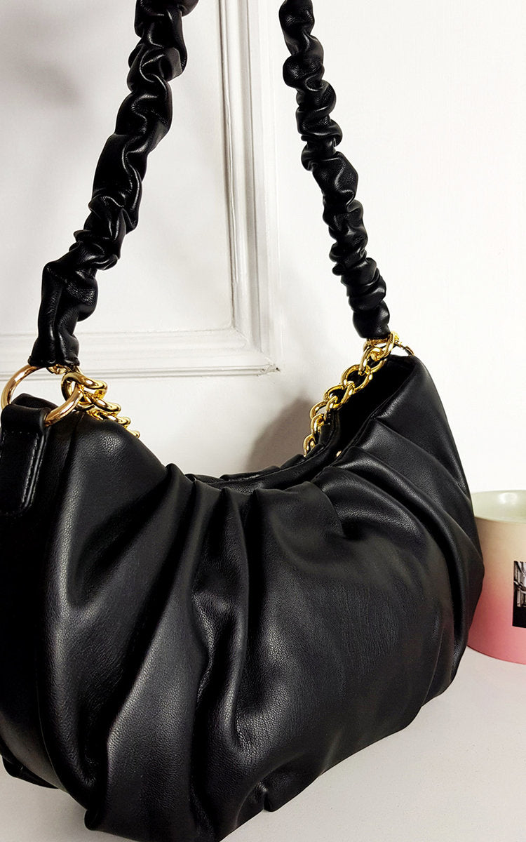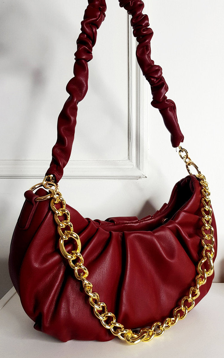 If you're feeling a bit casual with your latest date out, look no further than this Caroline bag. The scrunched textured handle, gold chain detail and oval shape create the perfect balance between sultry and sophisticated for any occasion.