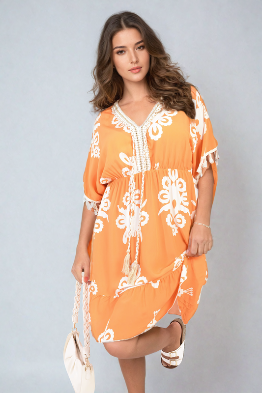 Printed V-Neck Short Sleeve Midi Dress with Tassel Detail