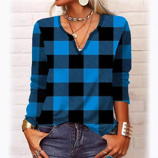 Plaid & Printed Top V-neck Loose Long Sleeve Shirt For Women