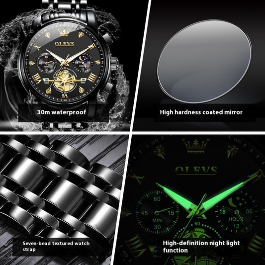 Men's Multi-functional Business Style Leather Belt Waterproof Luminous Calendar Watch