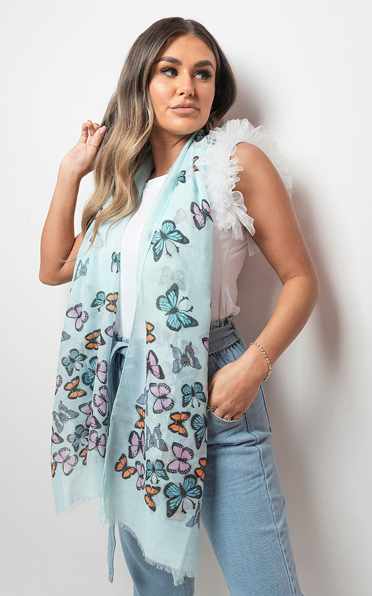 The Sienna Butterfly Print Maxi Scarf is perfect for any season, whether you want to add a pop of color to a monochrome outfit during colder months or enhance your breezy summer attire with its vibrant patterns. Its versatility makes it a wardrobe staple that can effortlessly elevate any ensemble.