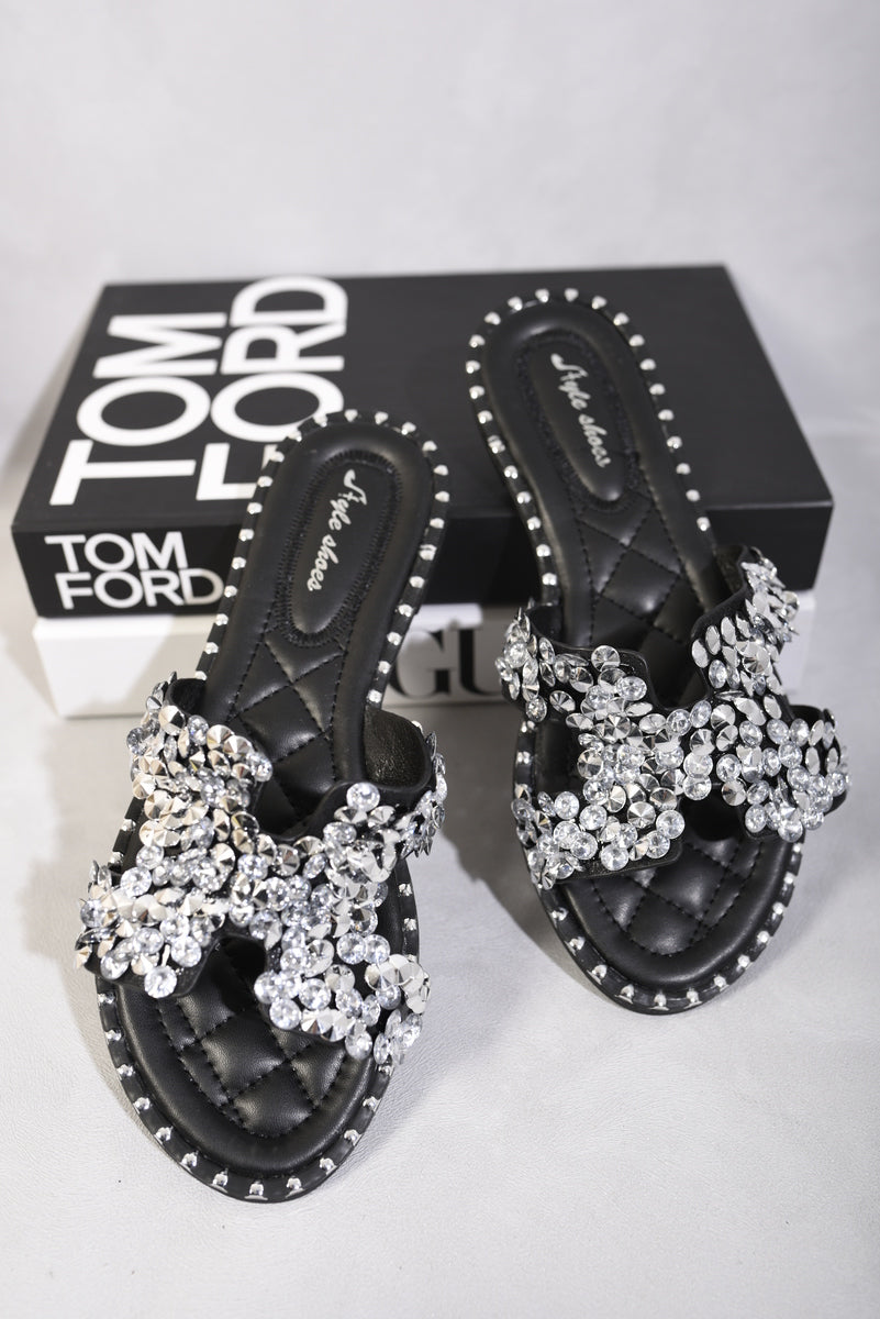 Don't wait - add some sparkle to your shoe collection with the Desiree Embellished Open Toe Flat Sandals!