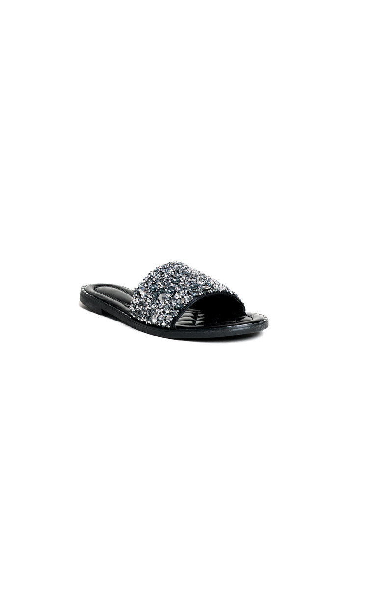 our SOFIE sandals feature faux leather material, metallic finish, diamante and crystal embellishment and slip on slider style. Perfect for your summer vacay, add a floral midi for a seriously cute look.