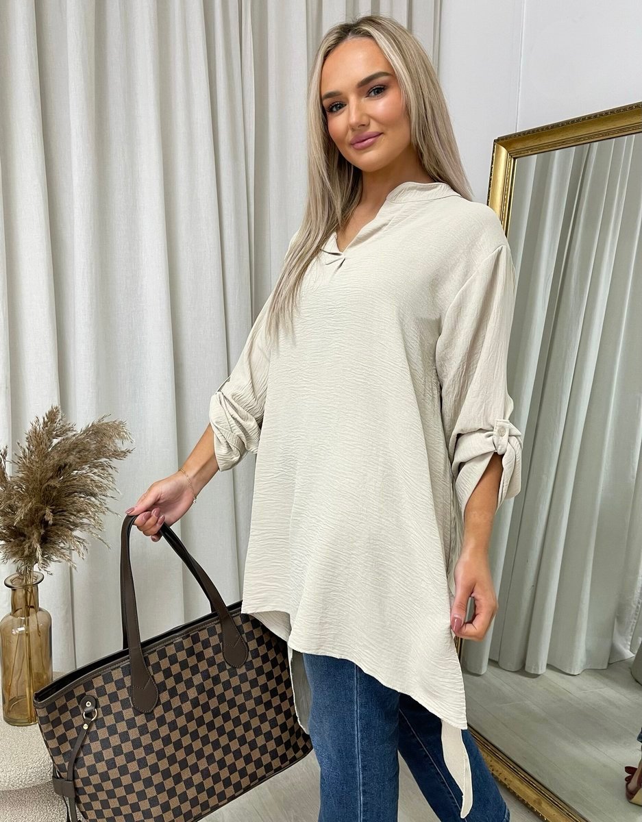 Get comfy with the Emily Long Back Roll Up Sleeve Loose Fit Top! This top rocks a cool long back, roll-up sleeves, and a relaxed loose fit, making it a must-have for any outfit mix. Whether you're chilling or spicing it up, it’s all about effortless style and endless versatility.