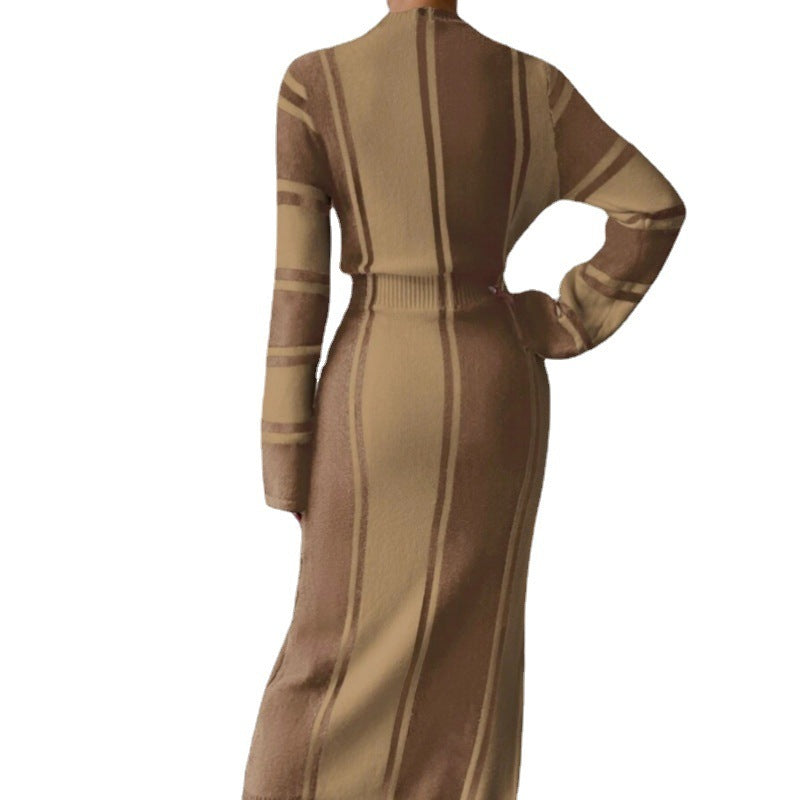 Long Striped Crew Neck Casual Women's Knitted Dress