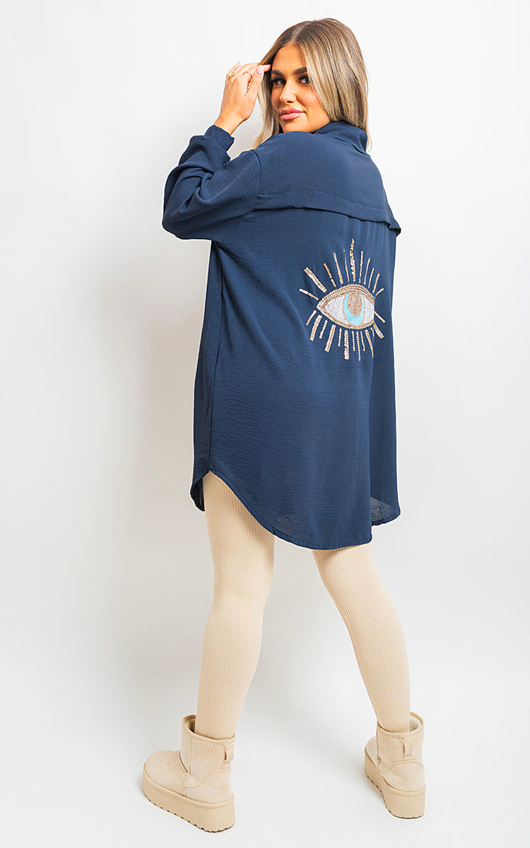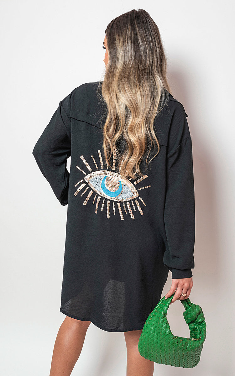 Introducing the Gracie Oversized Long Sleeve Gold Sequin Eye Button Up Shirt!