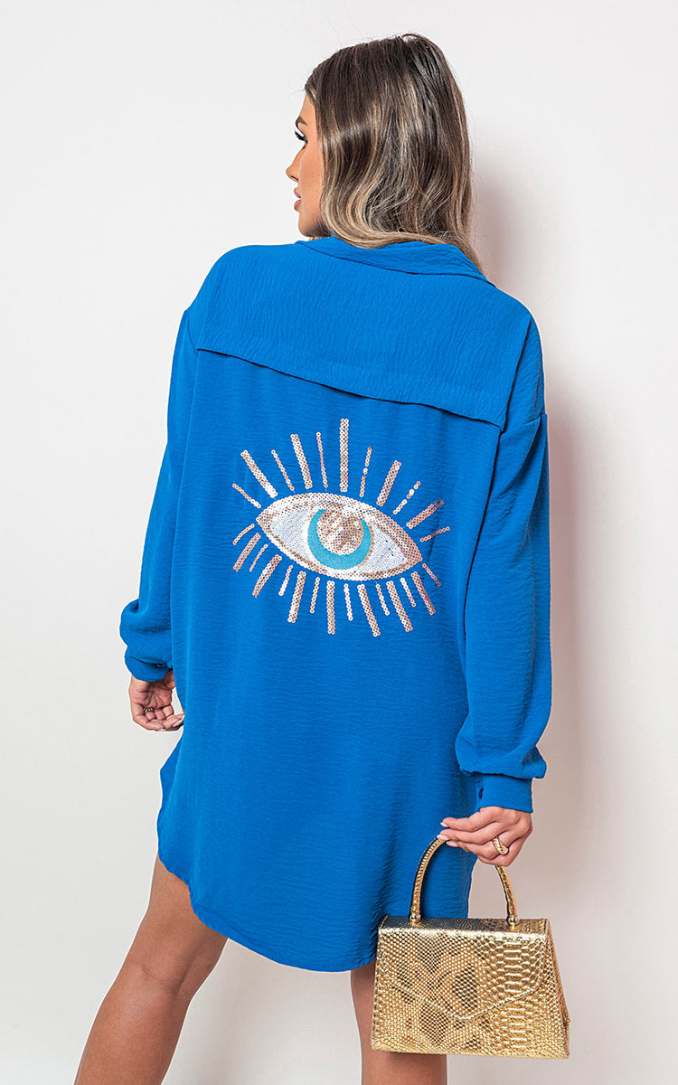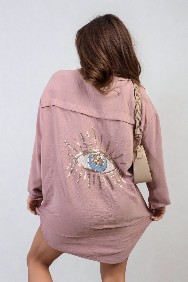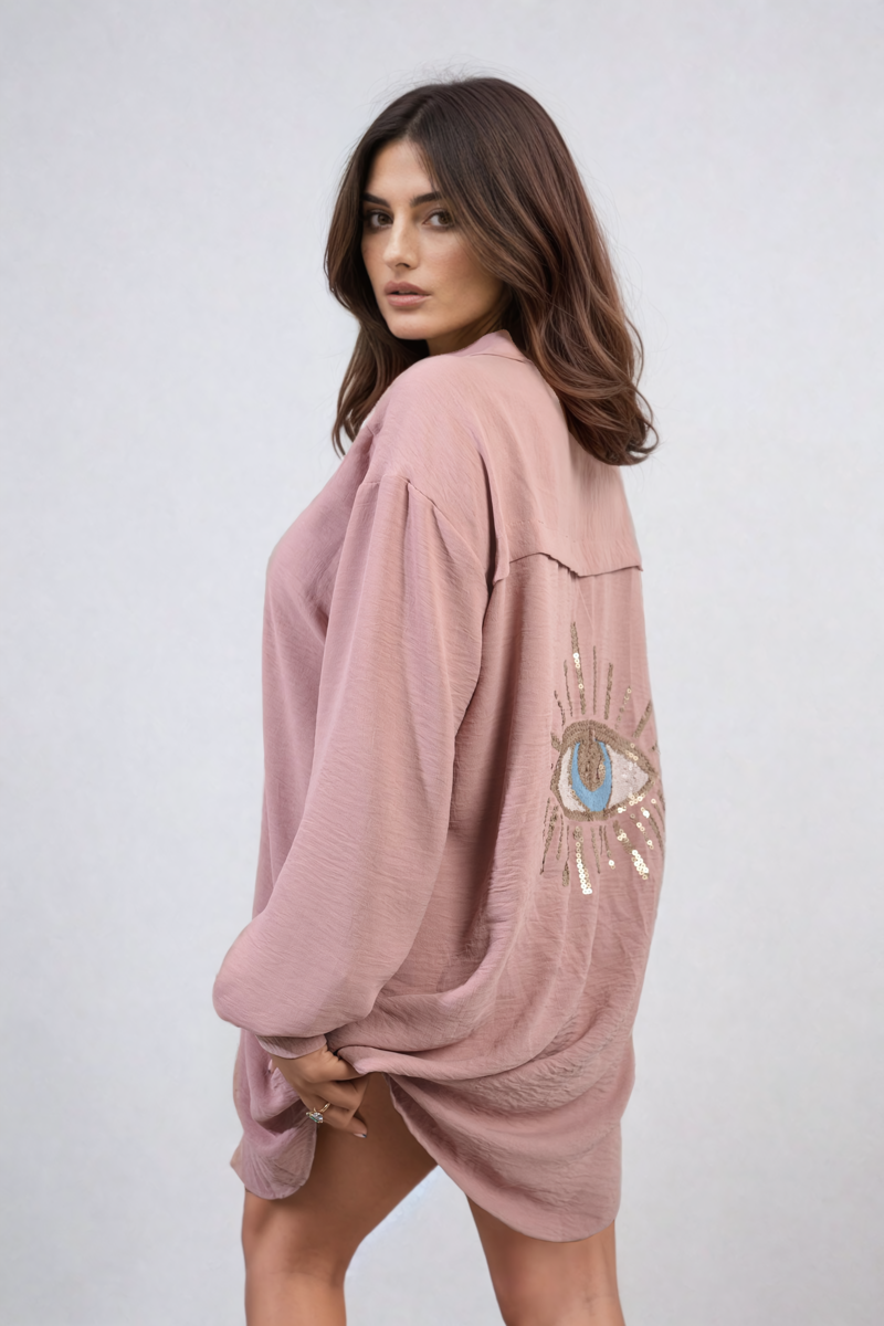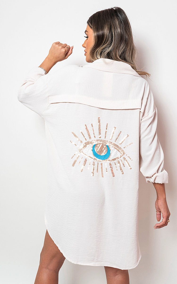 Oversized Long Sleeve Gold Sequin Eye Button Up Shirt