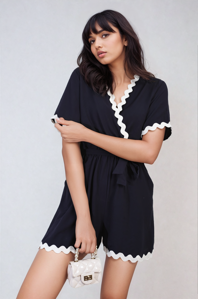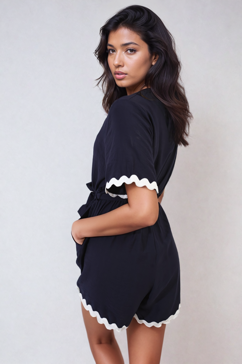 Loretta Scalloped Trim Wrap Over Playsuit is a charming and stylish outfit for any occasion. It features a wrap design with cute scalloped edges, giving it a playful and elegant look. Perfect for dressing up or down, this playsuit is both comfy and eye-catching.