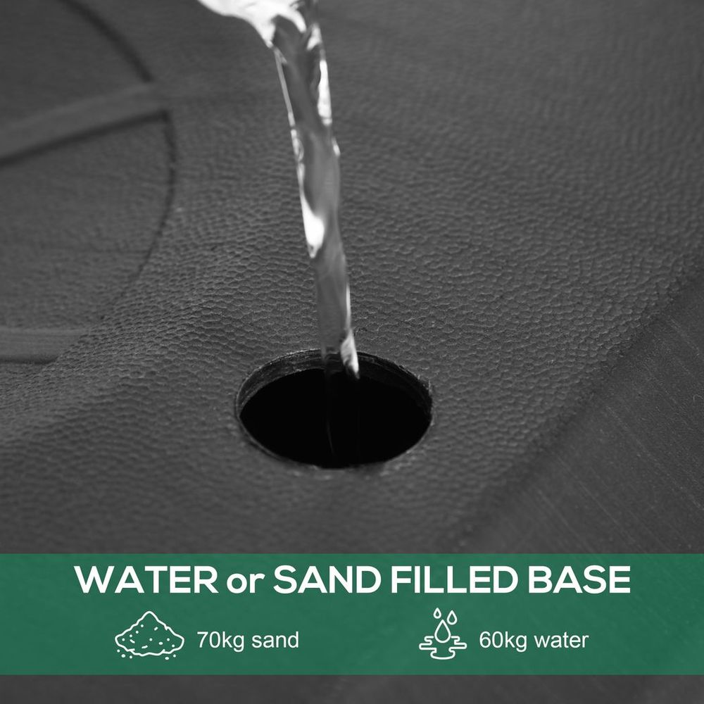 - Base stable : peut être remplie de sable ou d'eau pour une fixation ferme au sol. Capacité de poids : 60 kg d'eau ou 70 kg de sable.