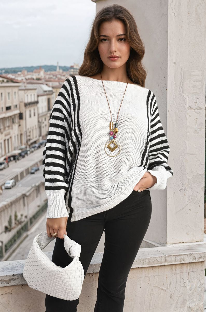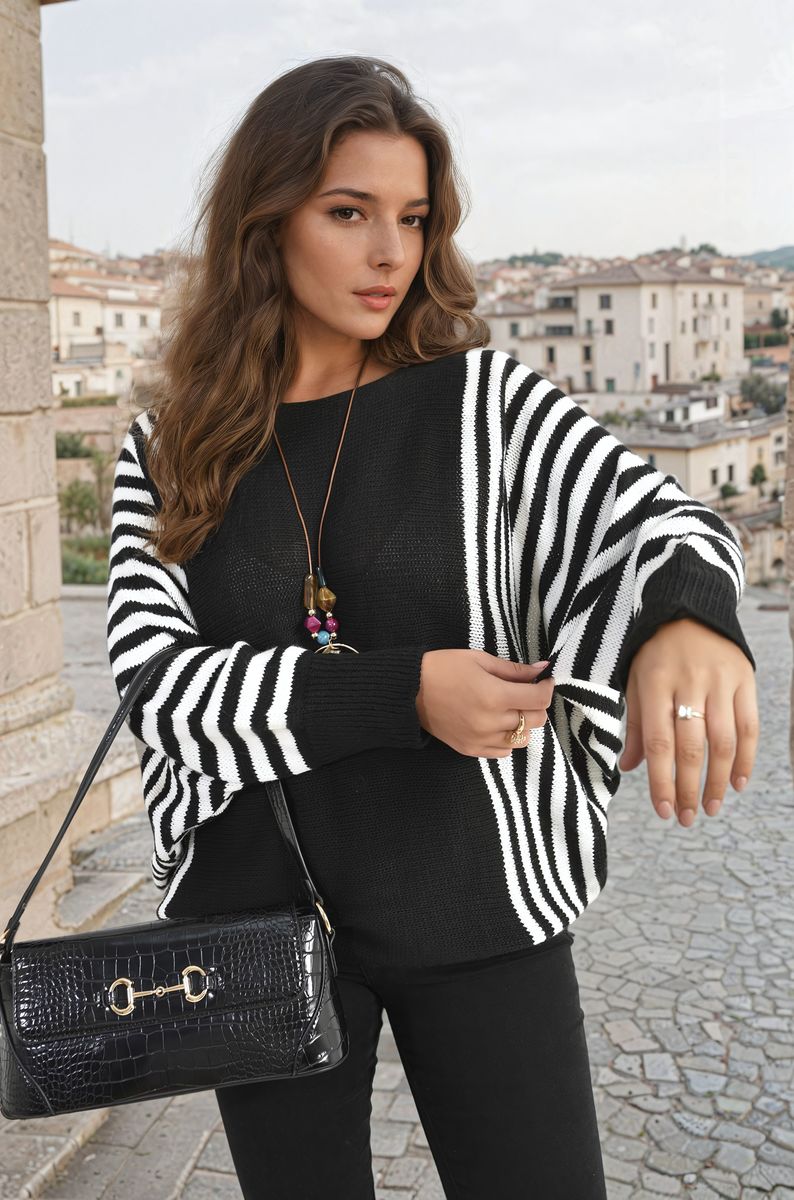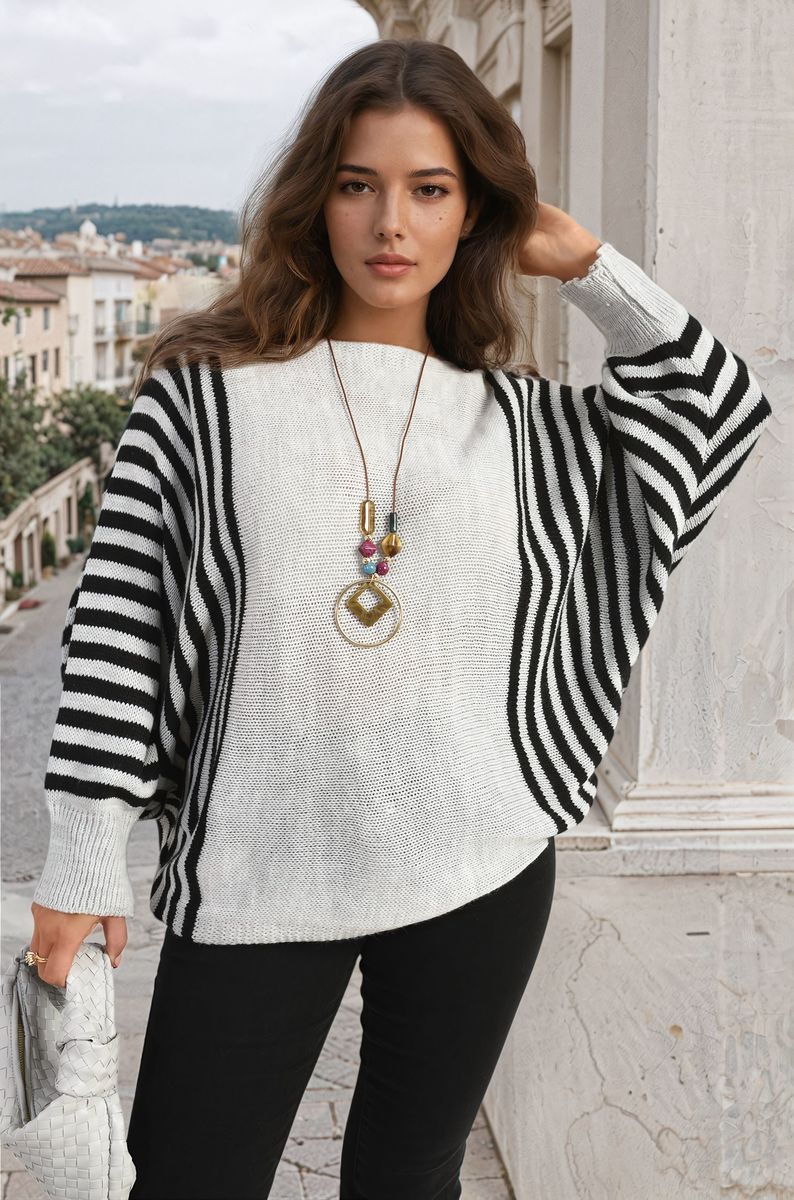 Snuggle up in the Reyna Striped Batwing Long Sleeve Knitted Jumper! With its fun striped pattern and roomy batwing sleeves, this jumper is all about comfort and style. The cozy knit keeps you warm, whether you're hanging out at home or heading out for a casual day. It's your new go-to for laid-back vibes!