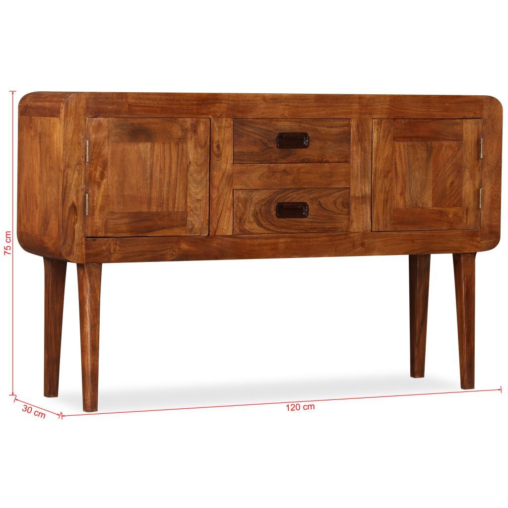 This stylish and practical wooden sideboard will make a timeless addition to your home decor. It can be also used as a highboard. This side cabinet is made of solid acacia wood with a honey touch finish. Acacia is a durable tropical hardwood. The sideboard is fully handmade, and the beautiful wood grains make every piece of furniture unique and slightly different from each other. Its 2 cupboards and 2 drawers provide ample space for keeping all kinds of smaller items organised and within reach, while its strong wooden legs contribute to its sturdiness. Each cupboard has a door with a special hinge, in this way the door doesn't need a door handle. Assembly is easy. Important note: The colours vary from piece to piece, making each piece unique. The delivery is random, ensuring the exclusivity and individuality of your product.