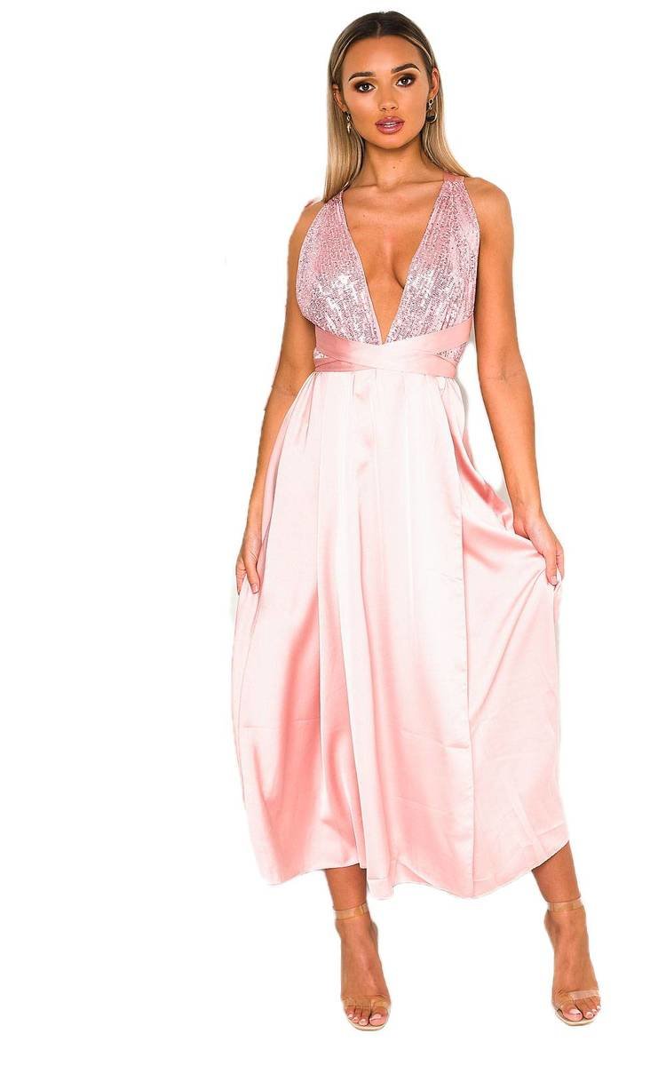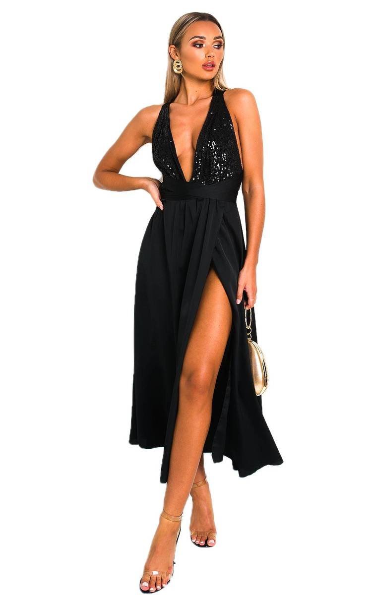 our STEPHANIE dress features midi length, backless design with tie halterneck finish and sequin front. Pair with heels and a statement earrings for a glam vibe.