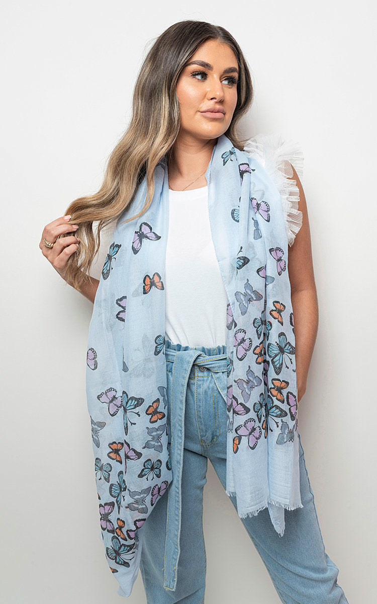 The Sienna Butterfly Print Maxi Scarf is perfect for any season, whether you want to add a pop of color to a monochrome outfit during colder months or enhance your breezy summer attire with its vibrant patterns. Its versatility makes it a wardrobe staple that can effortlessly elevate any ensemble.