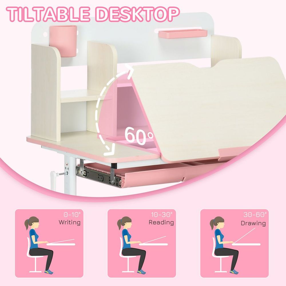 Get ready for a fun and productive study session with the HOMCOM Kids Desk and Chair Set! This playful pink set not only features adjustable and ergonomic design for comfort, but also comes with storage shelves and a washable cover for easy clean-up. Sturdy and practical, it's sure to make learning a breeze!