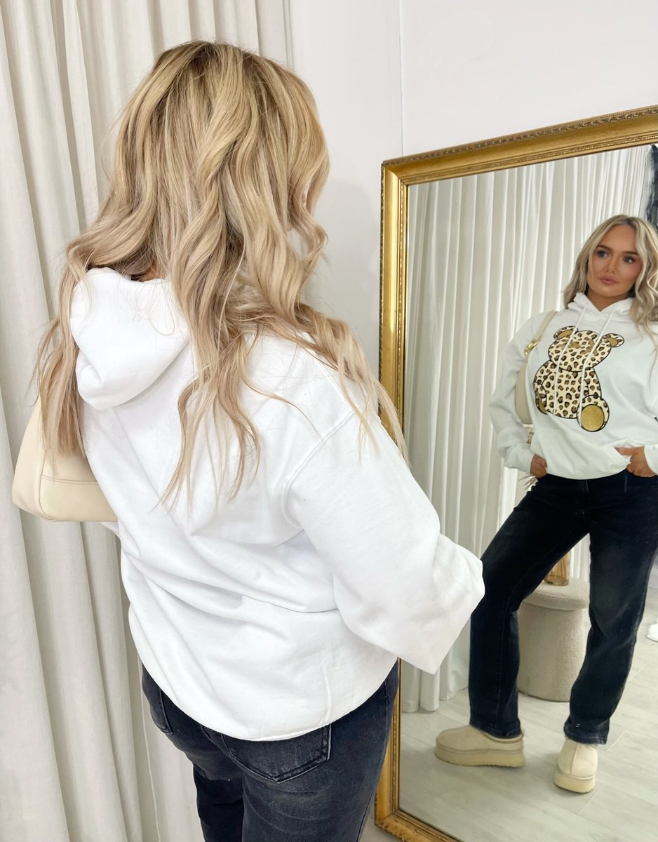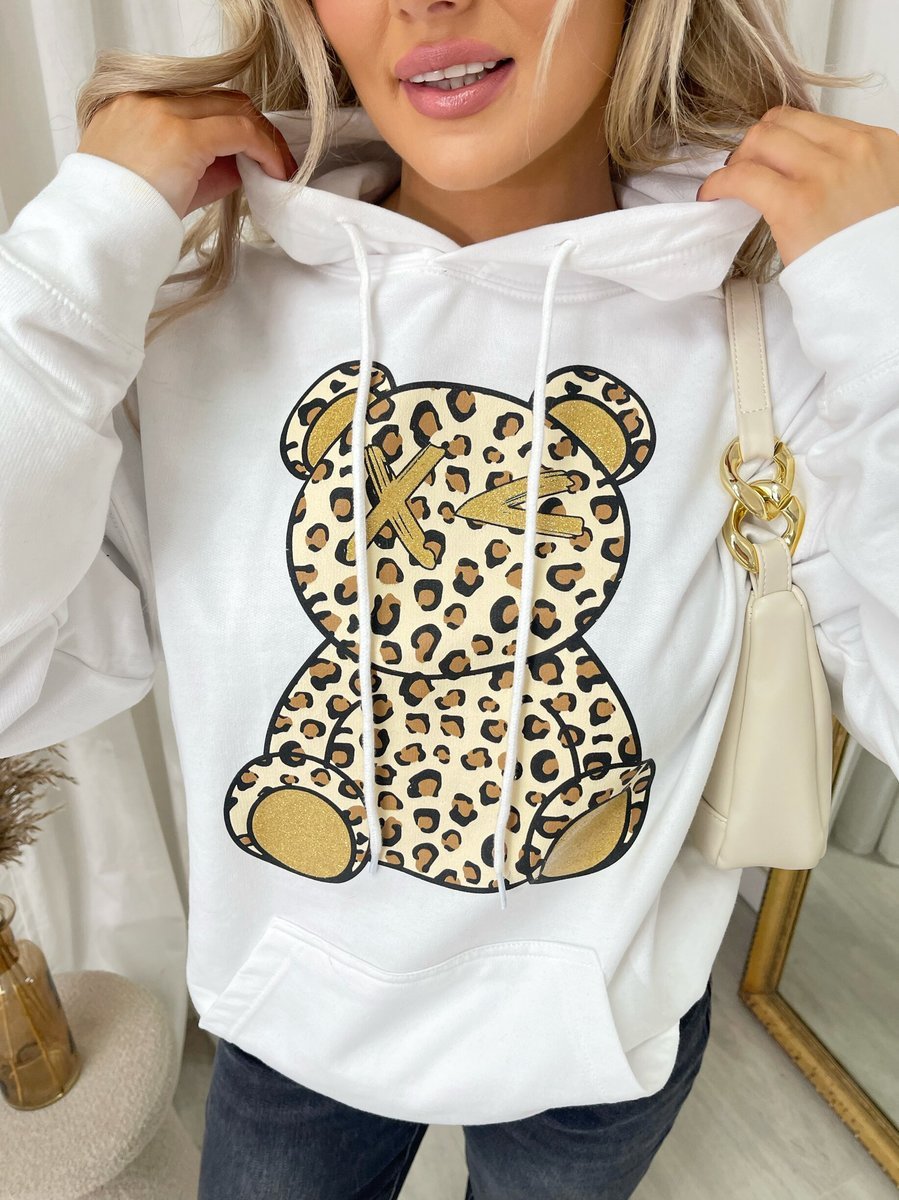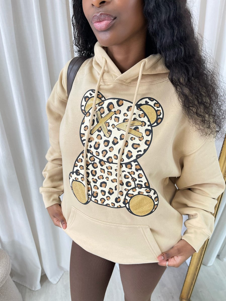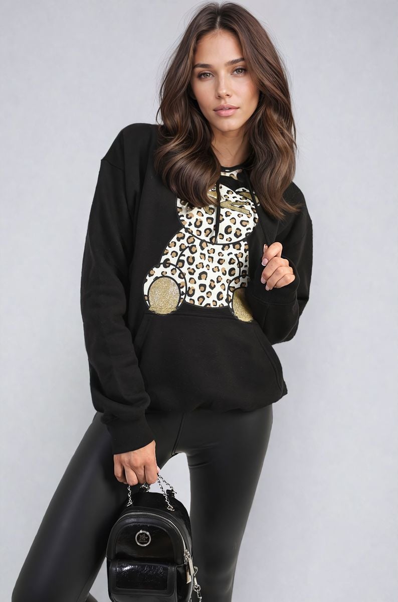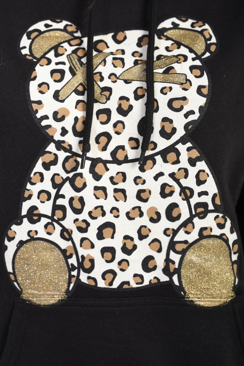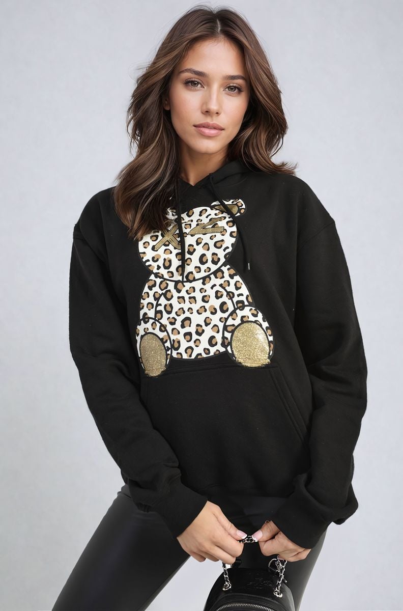 Get wild and cozy with the Delia Long Sleeve Leopard Print Teddy Graphic Hoodie. This fun hoodie features a playful teddy graphic and eye-catching leopard print, perfect for adding a pop of personality to your outfit. With its comfy fit and long sleeves, it's ideal for staying warm and stylish on laid-back days.