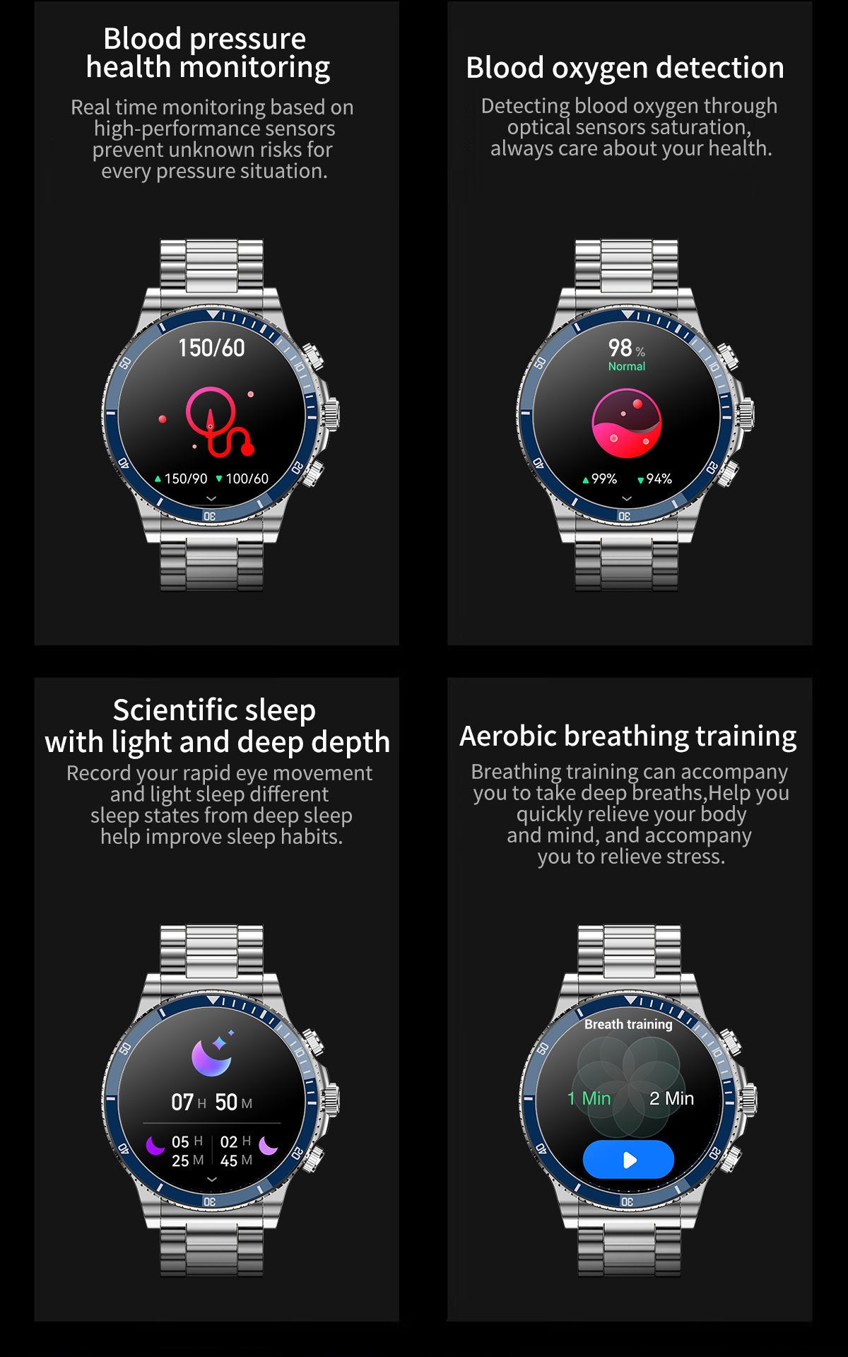 Functions: Waterproof, step counting, heart rate monitoring, blood pressure measurement, Bluetooth call, smart reminder, remote control selfie, sleep monitoring, blood oxygen detection