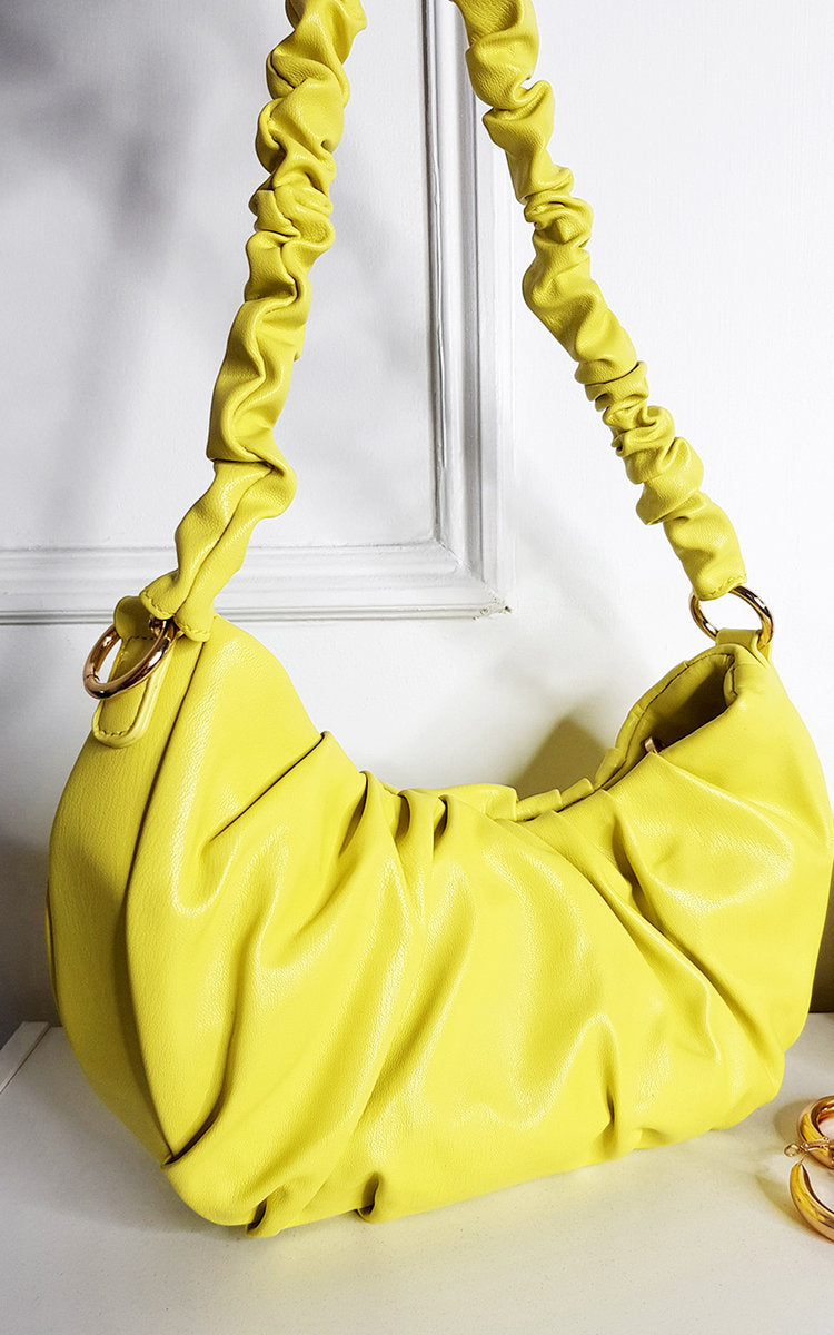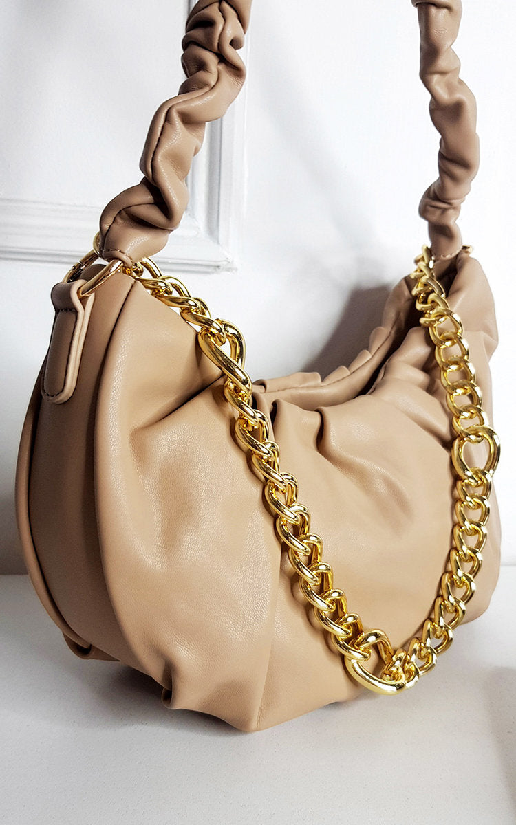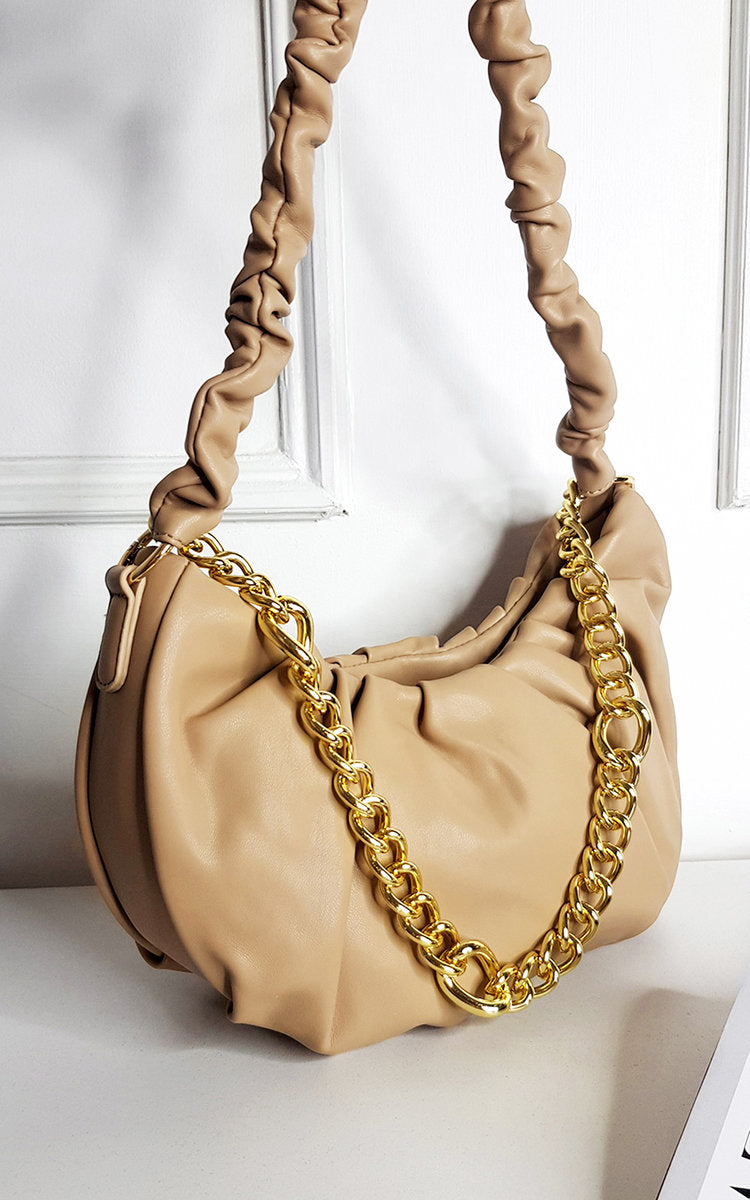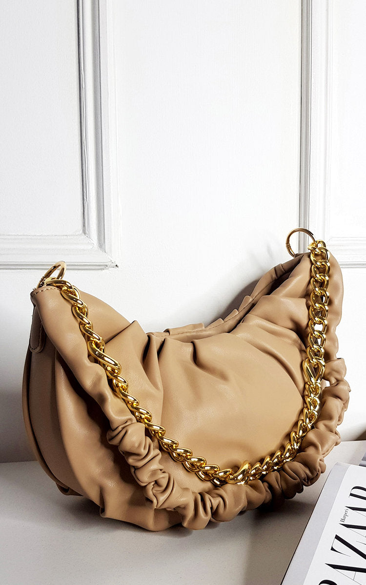 If you're feeling a bit casual with your latest date out, look no further than this Caroline bag. The scrunched textured handle, gold chain detail and oval shape create the perfect balance between sultry and sophisticated for any occasion.