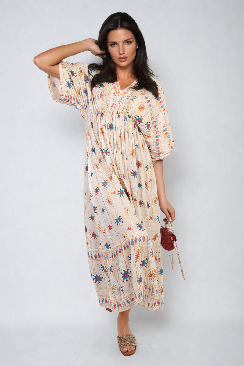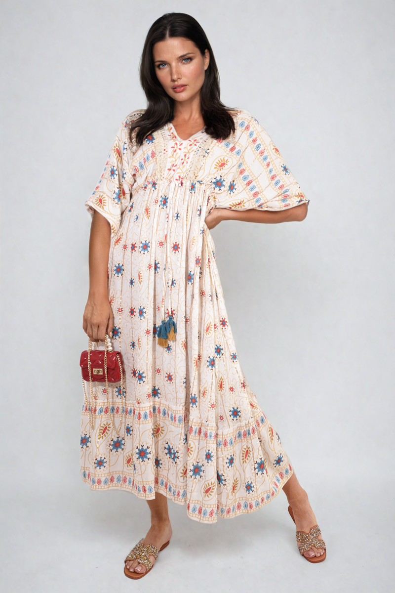 V-Neck Rope Tassel Printed Detail Maxi Dress