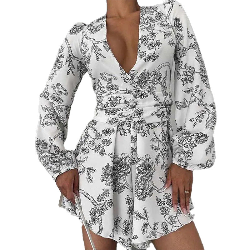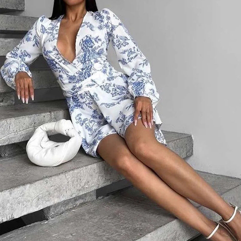 Women's Sexy V-neck Printed Lantern Sleeve Waist-tight Dress